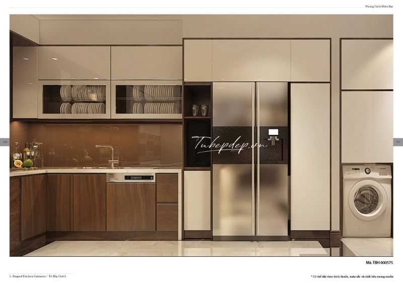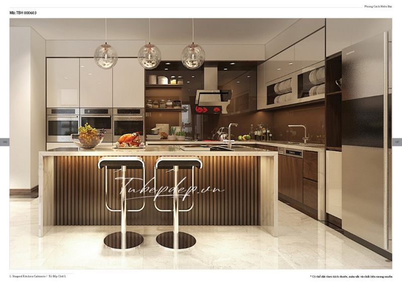 Chiêm ngưỡng mẫu thiết kế phòng bếp sang trọng mang phong cách hiện đại có hệ thống tủ bếp 2 tầng màu trắng - nâu tiện lợi để thấy những tính toán tỉ mỉ của các kiến trúc sư Morehome