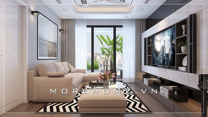 Mẫu thiết kế nội thất chung cư hiện đại tận dụng ánh sáng thiên nhiên chiếu vào qua cánh cửa hướng ban công lớn, kết hợp tông màu nội thất tươi sáng tạo cảm giác rộng rãi thoáng mát cho căn nhà