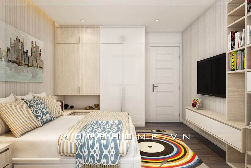 Thiết kế phòng ngủ chung cư đơn giản, hiện đại, các chi tiết nội thất không quá cầu kỳ nhưng vẫn đảm bảo công năng trong quá trình sử dụng