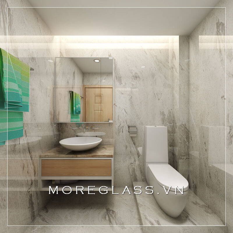 Mẫu đá ốp trắng cao cấp với những đường vân loang xám ấn tượng sẽ làm cho không gian phòng tắm trở nên sang trọng và đẳng cấp.