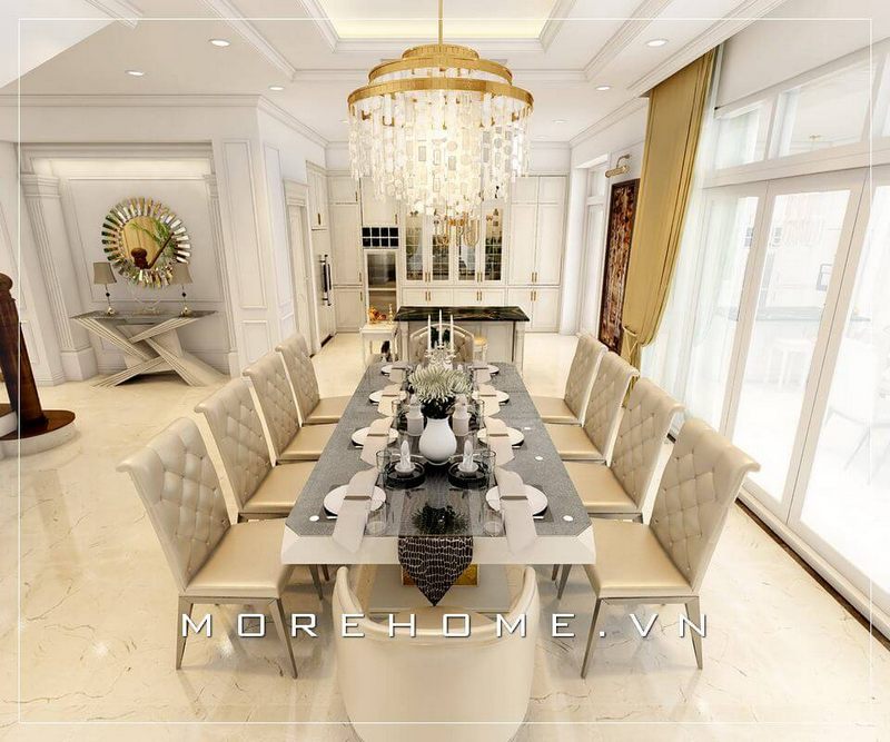 Bàn ghế ăn lớn được đặt trong một không gian rộng lớn của biệt thự, nhà phố là trung tâm của căn phòng hiện đại.