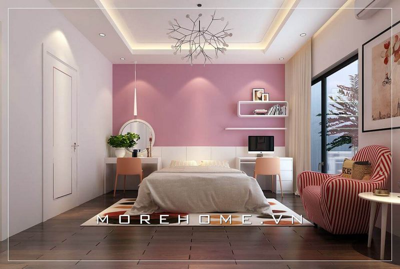 Phòng ngủ của con được thiết kế đơn giản với một giường gỗ công nghiệp, mảng tường đầu giường được làm bằng giấy dán tường hoa màu tím nhạt, tạo nên sự hài hòa và nhẹ nhàng.